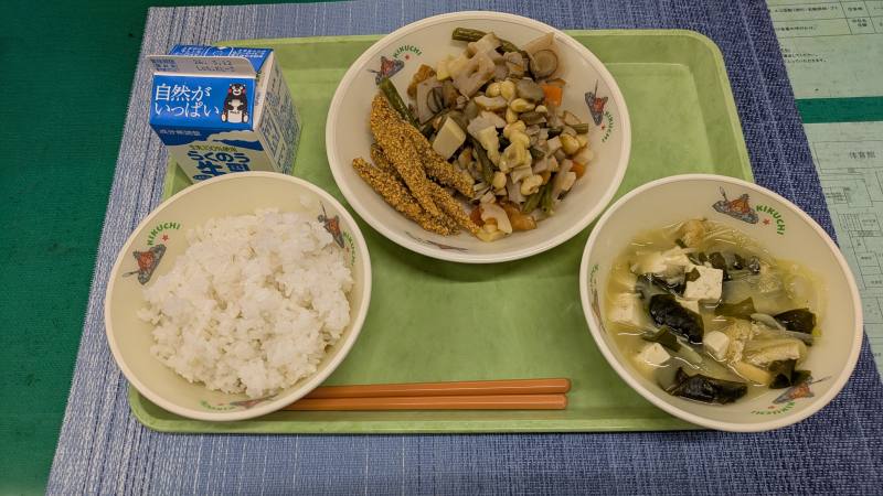 ・今日は泗水産のレンコンとごぼうが使われている和食メニューです!おかずの二品は、歯を鍛えるのにふさわしいおかずです🦷わかめの味噌汁は昆布とカツオの出汁が効いていて、風味が抜群な一品でした(≧▽≦)