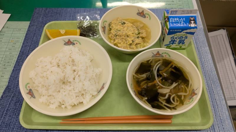 ・本日はふるさとくまさんdayで、今回は荒尾・玉名の味です!南関町の特産である南関揚げを甘辛く煮て、玉ねぎと卵でとじた南関揚げ丼が登場です。南関揚げが出汁を吸い込んで、ふっくらとなっています!南関町はそうめんでも有名ですが、本日は魚そうめんが提供されました!