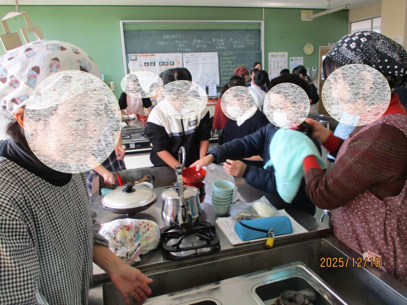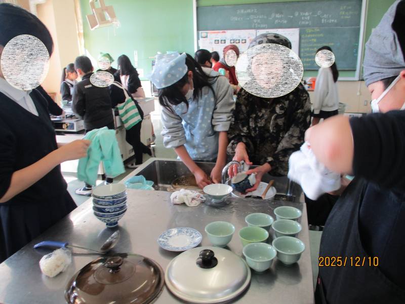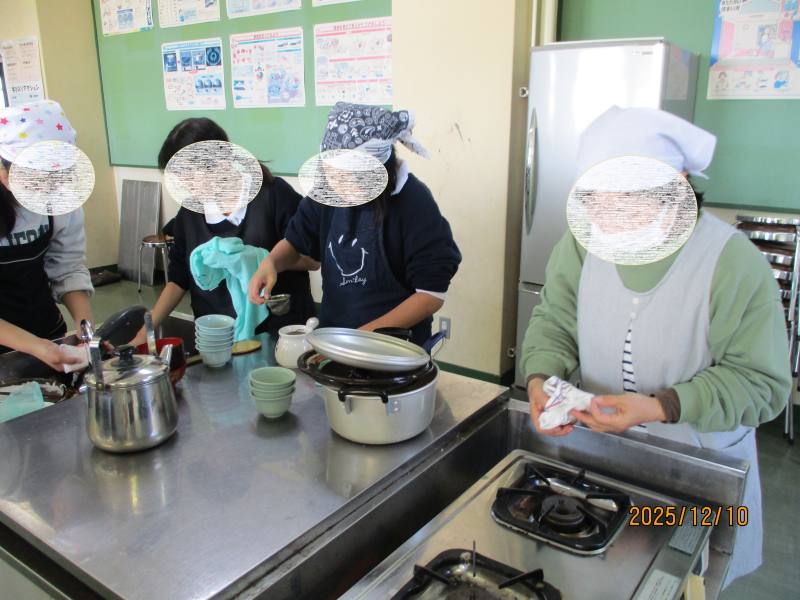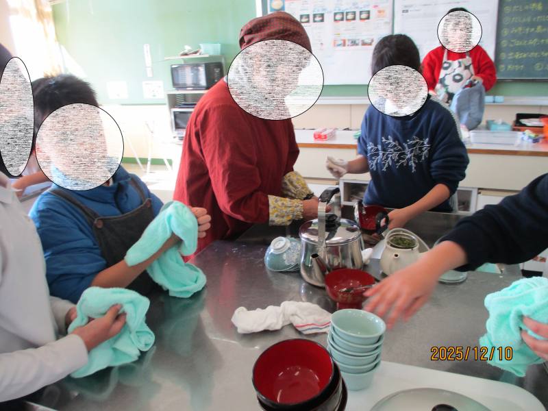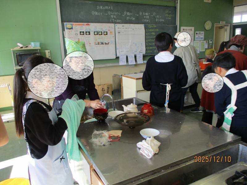 5年生は、地域ボランティアの方と一緒にごはんとみそ汁をつくりました。写真は、片付けの様子です。子どもたちもボランティアの方々もみんな「おいしかった」と感想を述べてくれました。一口いただきました。とってもおいしいみそ汁でした。