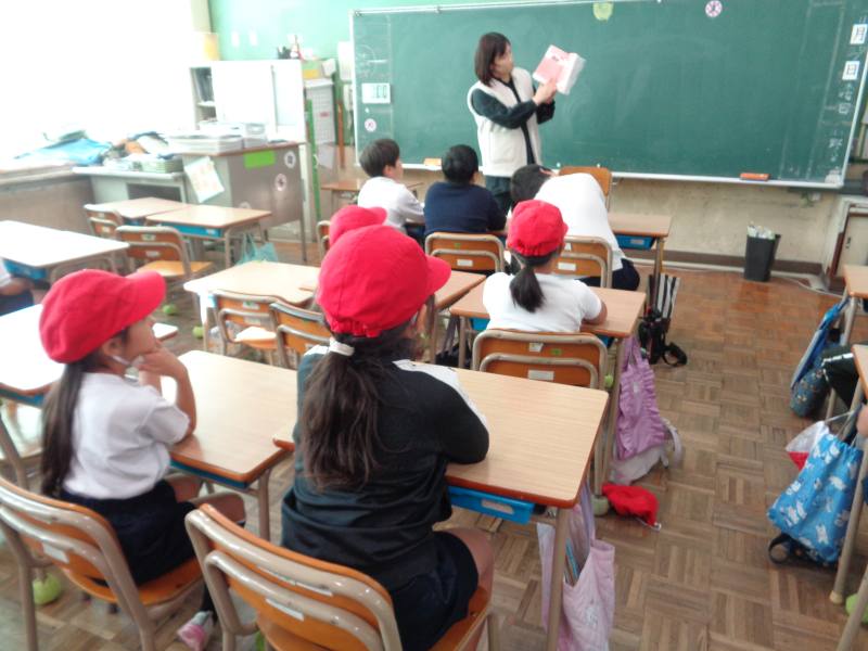 ブックバイキング読み聞かせを行いました。これは、教室に読み聞かせする本の題名をはっておき、児童は聞きたい話がある教室へいき、読み聞かせをしてくれる先生を待っておくというシステムです。