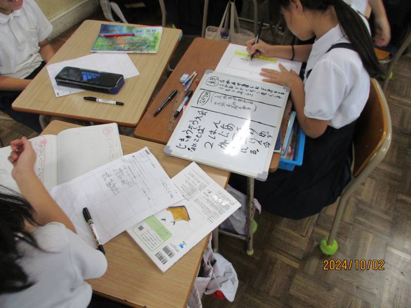 この日はそれぞれの班で、持久走のスローガンを考え、ホワイトボードにまとめ、話し合いで決まったスローガンをプリントに書き込む活動をしていました。