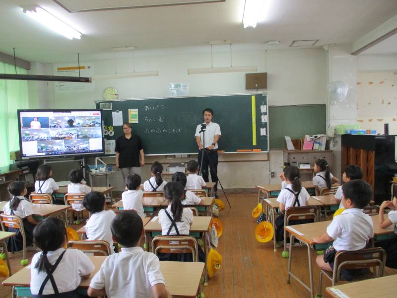 夏休み明け集会をオンラインで行いました。準備の都合上1年生教室で行いました。