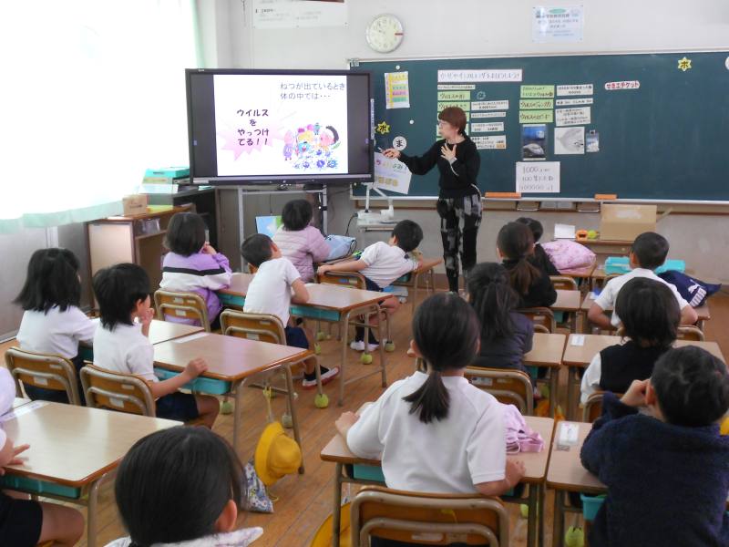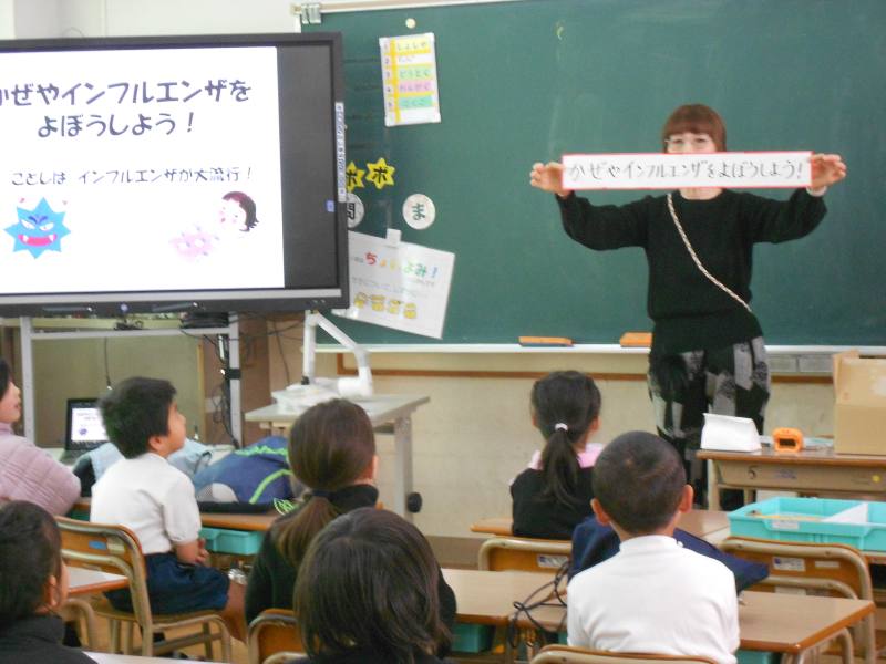 今月の保健指導は、インフルエンザをよぼうしようというテーマについての話でした。そのためには咳エチケットを守ることや早寝早起き朝ごはんが大切です。また手洗いも非常に重要です。熱い指導が行われました。