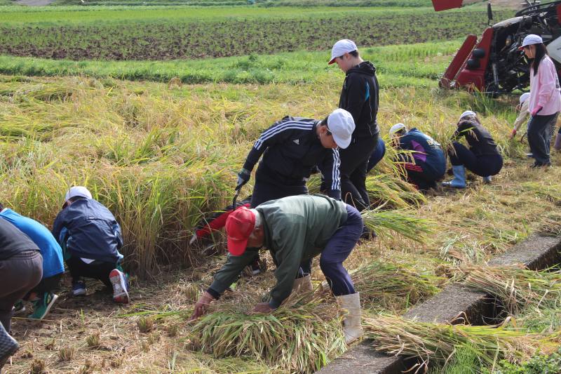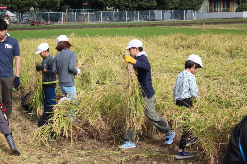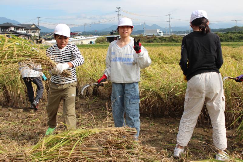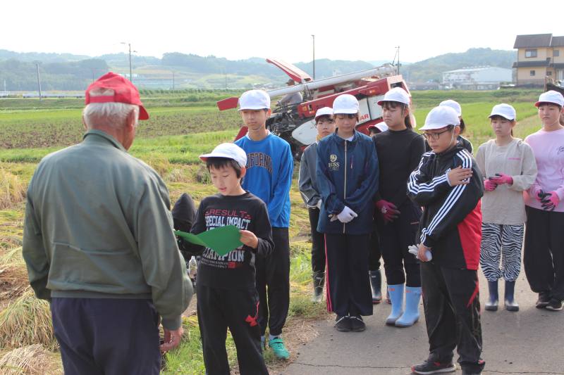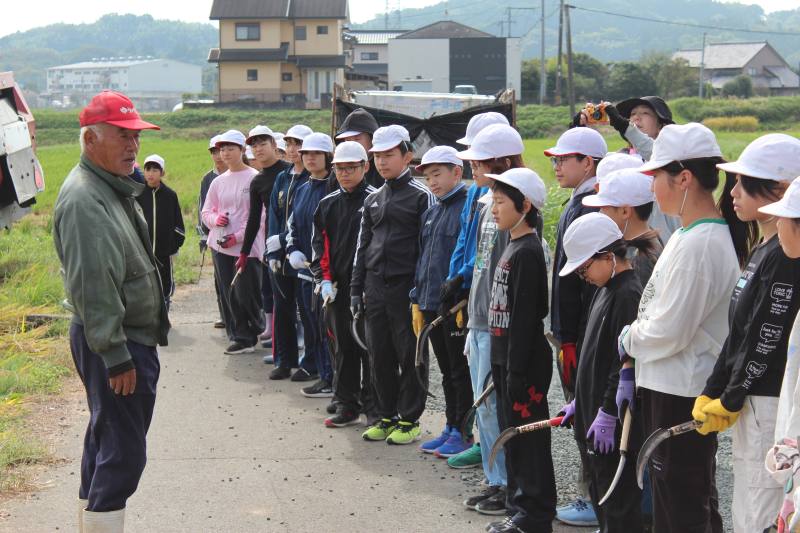 宮川忠正さんから食の大切さ、感謝について聞き、稲刈りの仕方を教えていただきました。