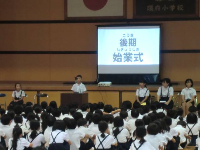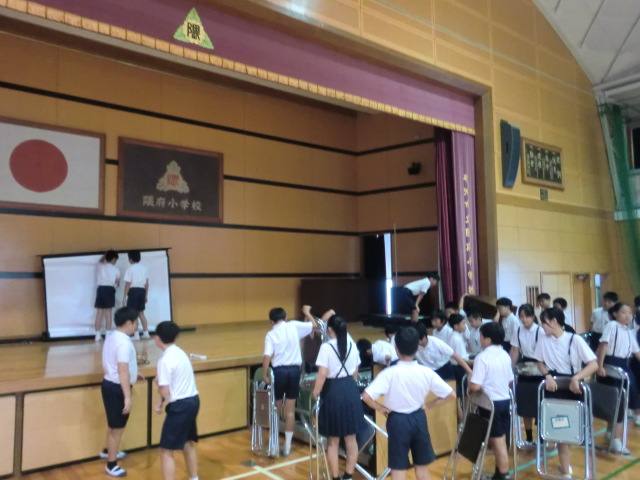16日(木)後期が始まりました。秋休み中に地域の行事に参加した人も多く、教室では思い出話で盛り上がっていました。後期の始業式では、衣替えについてのお話もありました。これからの季節に合わせて服装の対応も必要ですね。写真は始業式の後片付けをする6年生です。隈府小では6年生が集会や式の準備や片づけを率先して行います。サッと動く最上級生はとてもかっこいいです。これも隈府小の伝統の一つです。後期もよろしくお願いいたします。