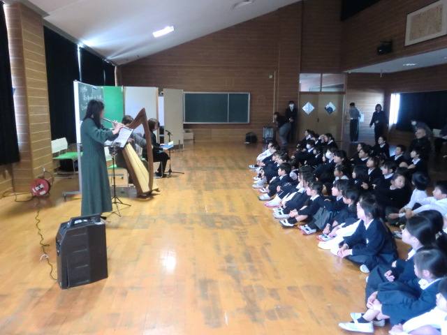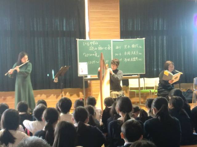 2月17日(火)の昼休みに、「ひるやすみ読み聞かせ会~ハープとフルートの調べと共に」と題して、地域の方々の読み聞かせ会が行われました。宮沢賢治作の「よだかの星」の読み聞かせを聞きながら、会場は場面に合わせたハープやフルートの音色に包まれました。普段体験することのない読み聞かせに驚きながらも、子どもたちは自然と「よだかの星」の世界に入り込んでいました。素敵な読み聞かせの会、ありがとうございました。