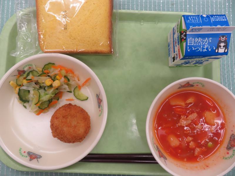 ミネストローネ、塩こうじチキンカツ、イタリアンサラダ、人参パン