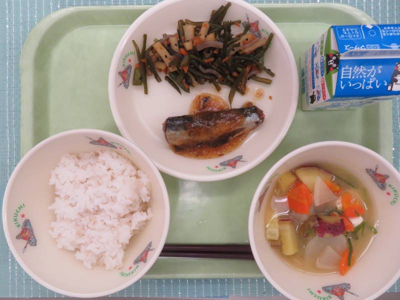 さつまいもの味噌汁、鰯の生姜煮、茎わかめのきんぴら、麦ごはん