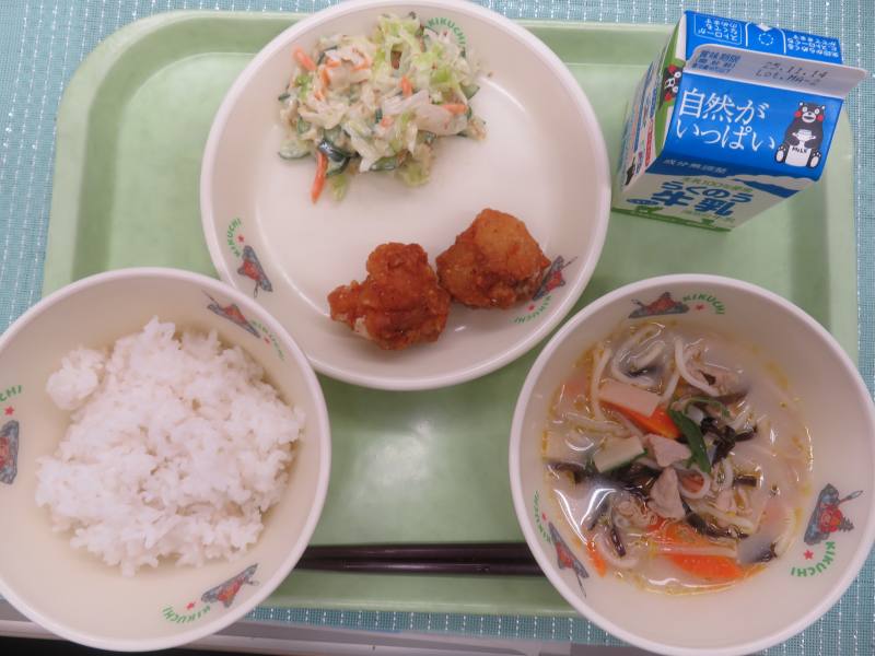 ラーメン風スープ、からあげ、ごまネーズサラダ、麦ごはん