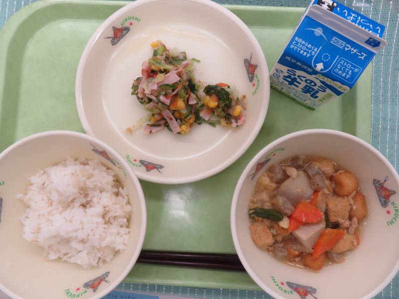 りっちゃんの元気サラダ、里芋のそぼろ煮、麦ごはん
