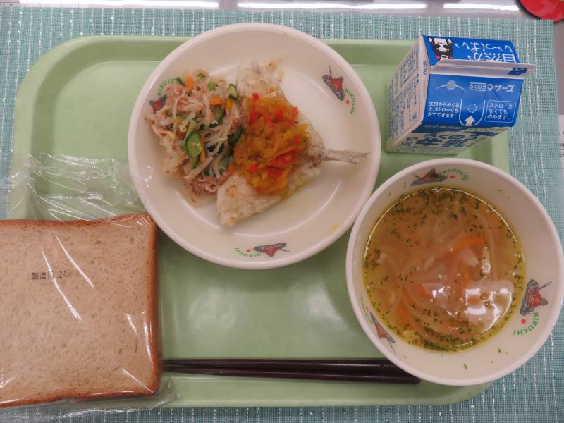オニオンスープ、アジのカレーマリネ、切干大根サラダ、黒糖パン