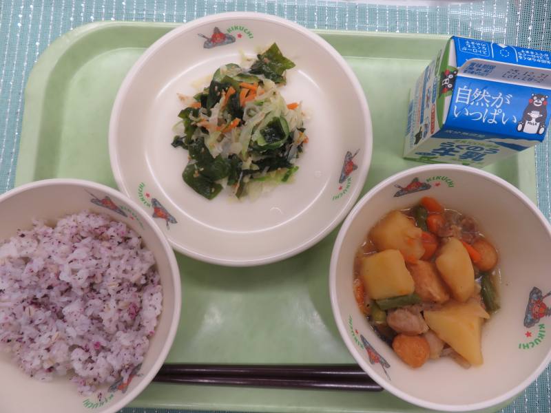 ゆかりご飯、じゃがいものうま煮、ごまじゃこサラダ