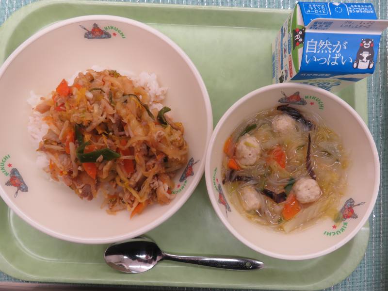 豚キムチ丼、肉団子と白菜のスープ