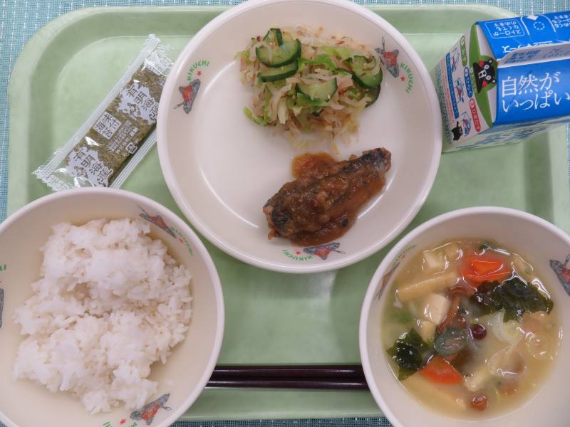 なめこ汁、いわしのみぞれ煮、たくわんあえ、のり、麦ごはん