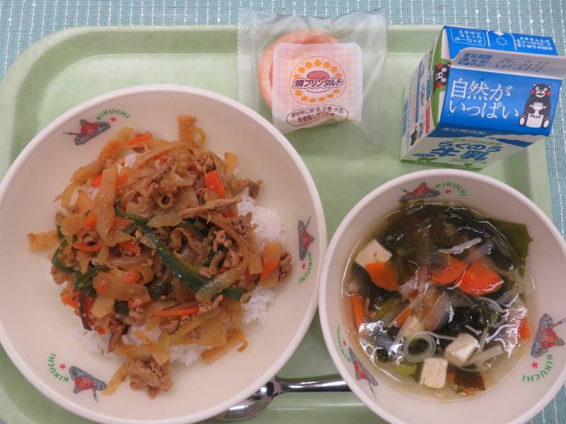ピリ辛スタミナ丼、わかめスープ、焼きプリンタルト