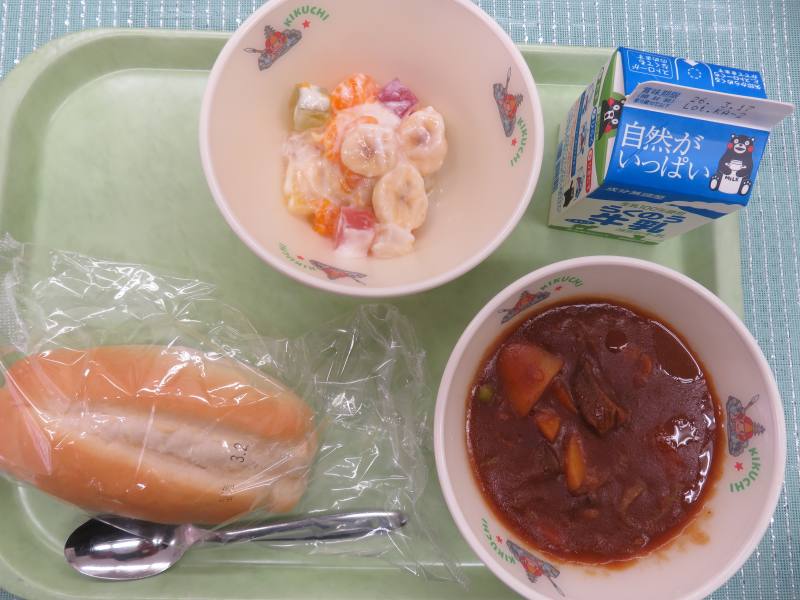 ビーフシチュー、フルーツヨーグルト、ソフトフランスパン