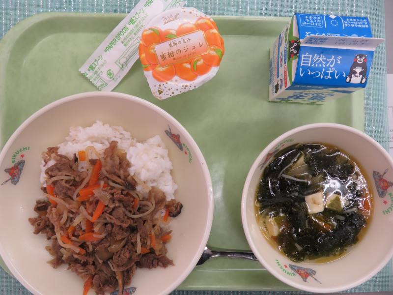 牛丼、わかめスープ、みかんゼリー