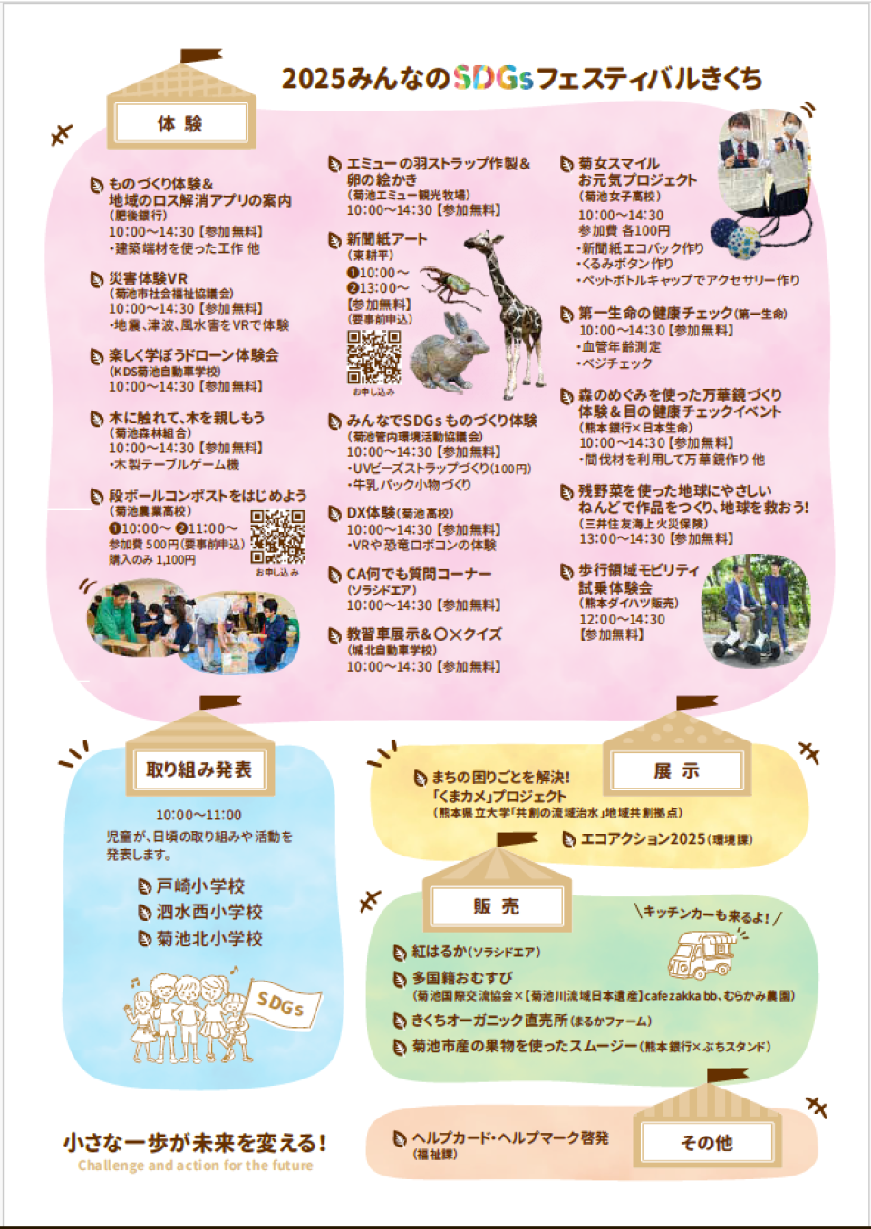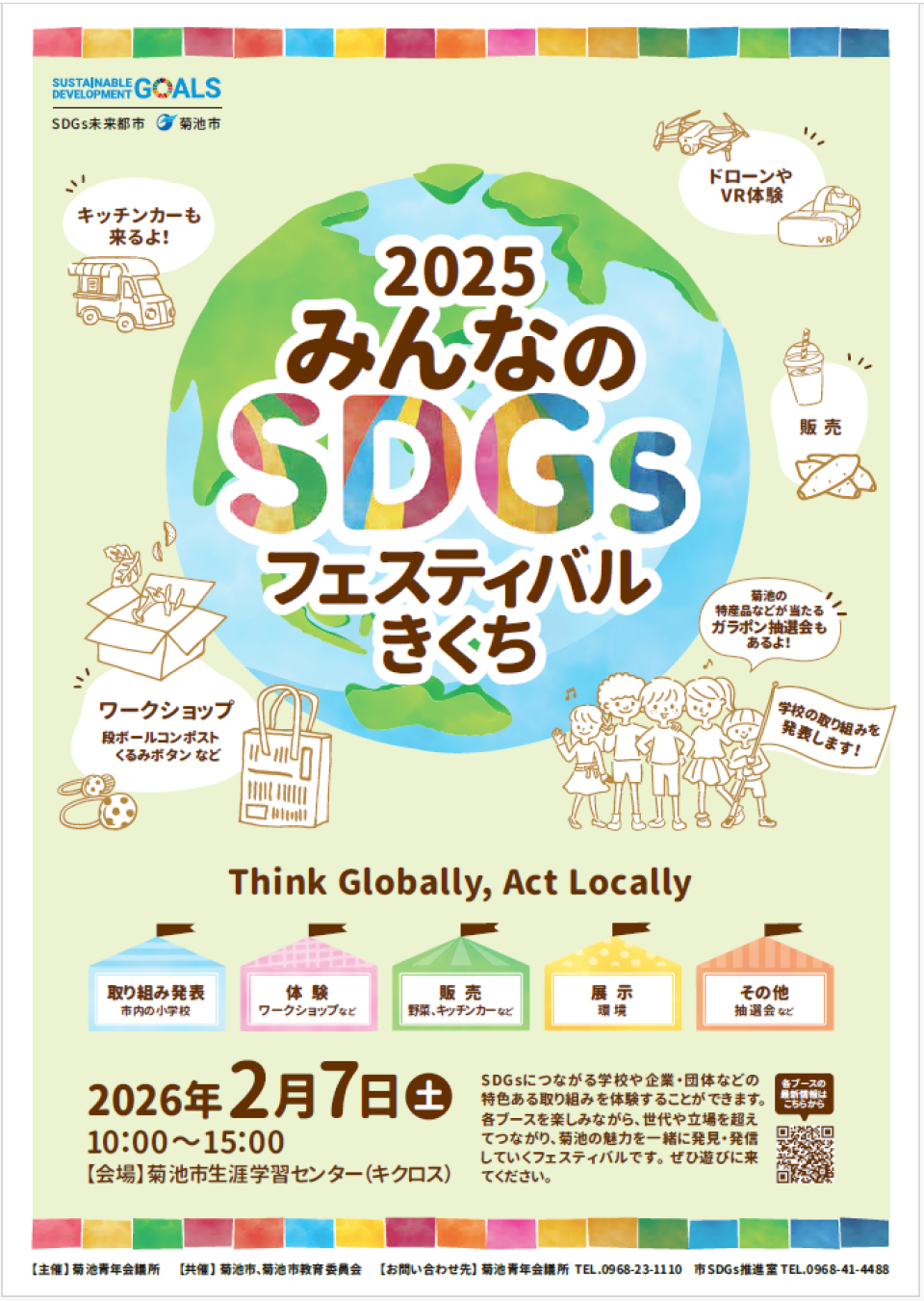 一般社団法人菊池青年会議所、菊池市、市教育委員会が共催し、SDGsにつながる市内の学校・企業・団体等 の特色ある取り組みを知ってもらうため、「2025みんなのSDGsフェスティバルきくち」を開催します!