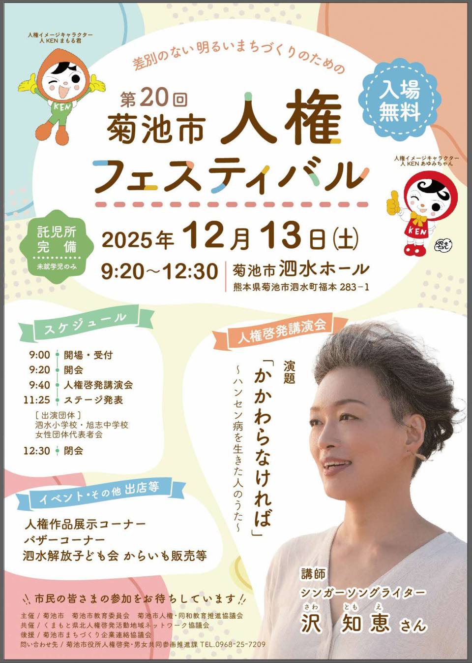 市民一人ひとりが部落差別をはじめとしたさまざまな人権問題の解決に取り組み、差別のない明るいまちづくりをめざすことを目的として、第20回菊池市人権フェスティバルを開催します。ステージイベントのほか、バザーコーナー、展示コーナー、託児所も完備しています。